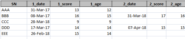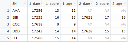 dcast(setDT(df)[], SN ~ Timepoint, value.var = c('date', 'score', 'age'))发布于 2018-05-09 13:06:18