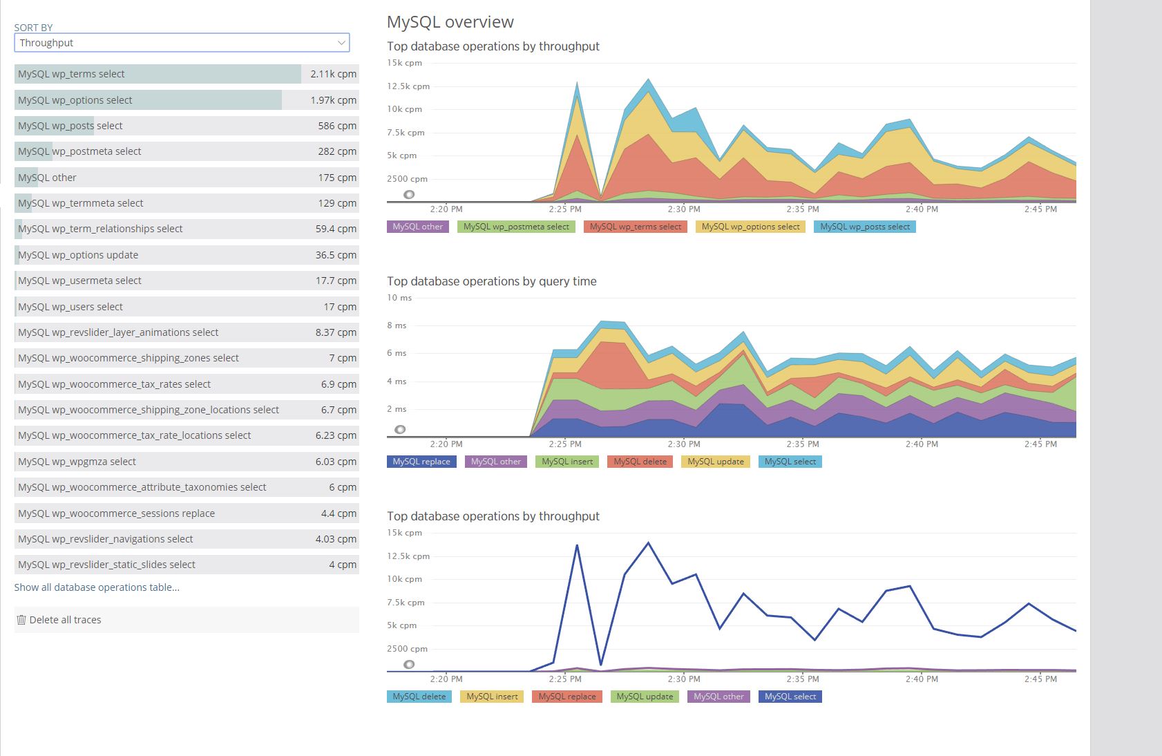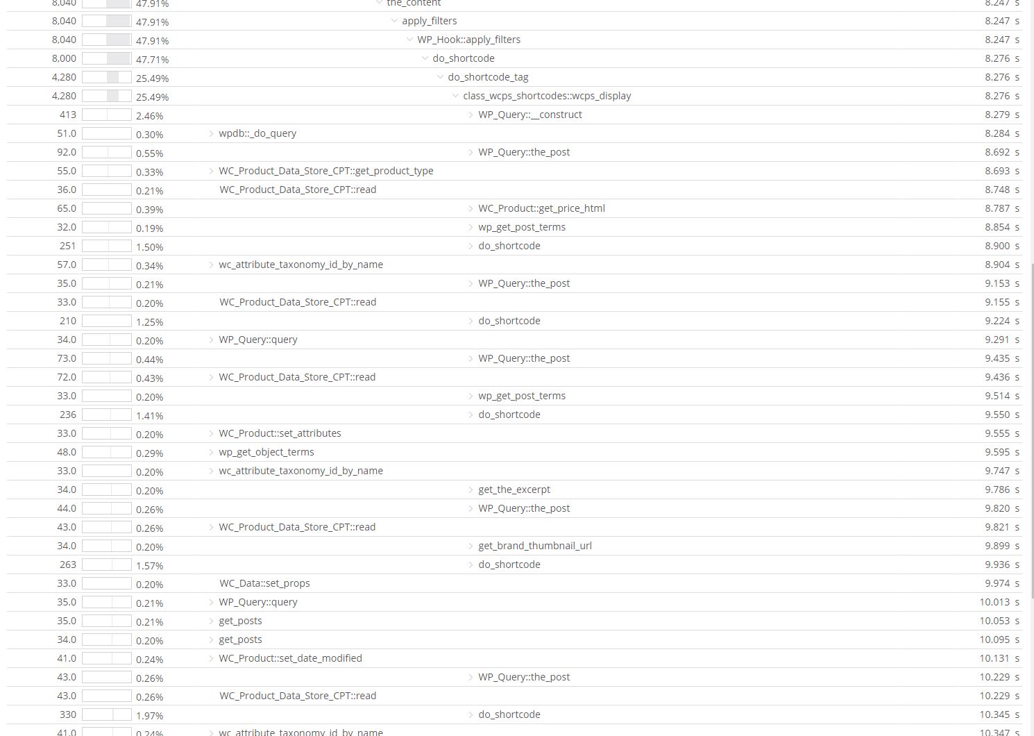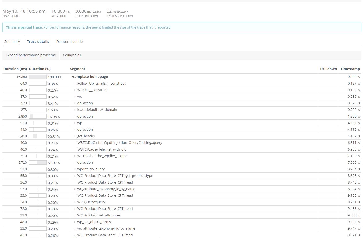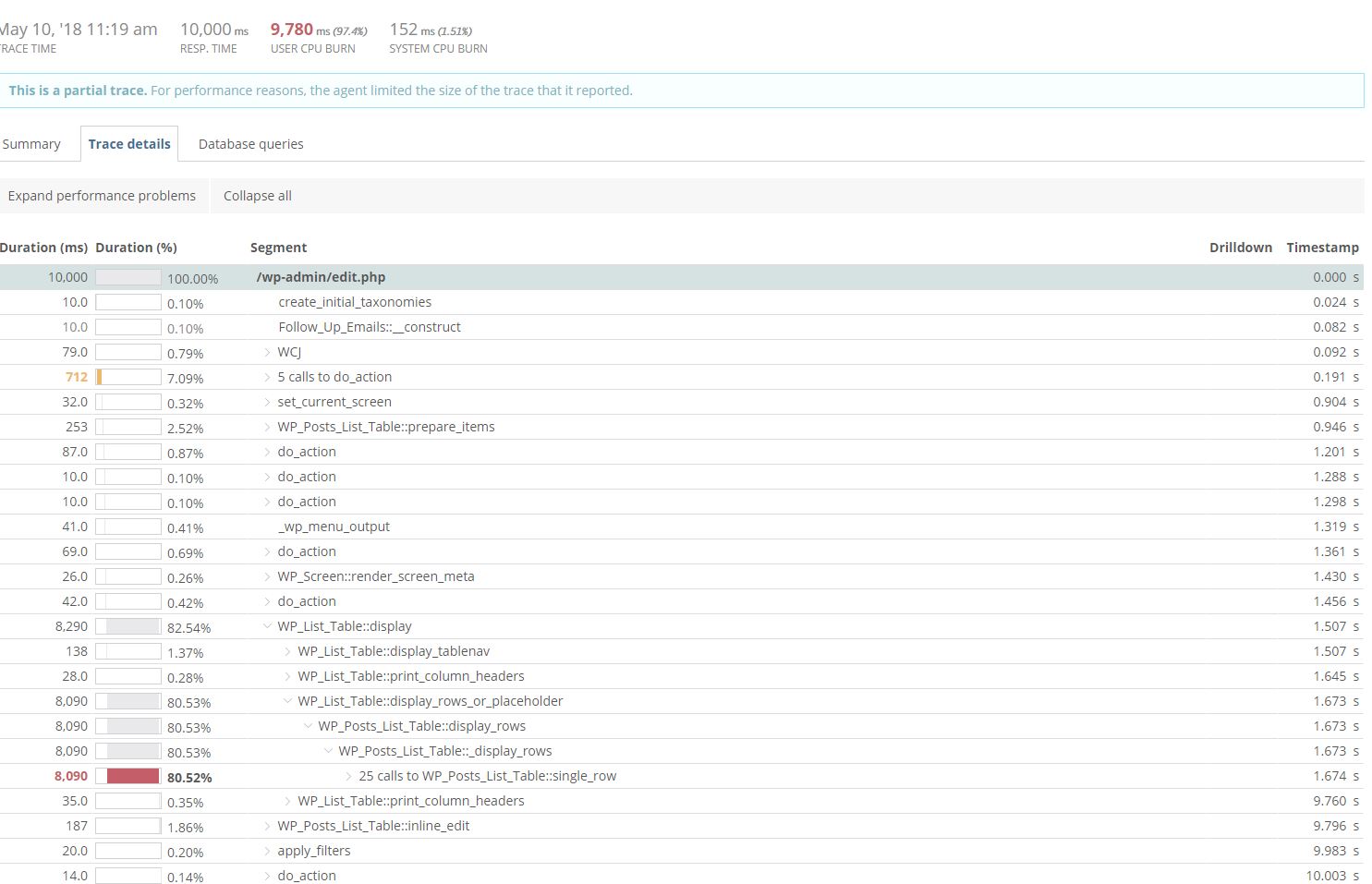 数据库查询每个查询14到30 is,但是在web事务跟踪上,可以看到打印产品(WP_List_Table::display)花费了太多的时间。
