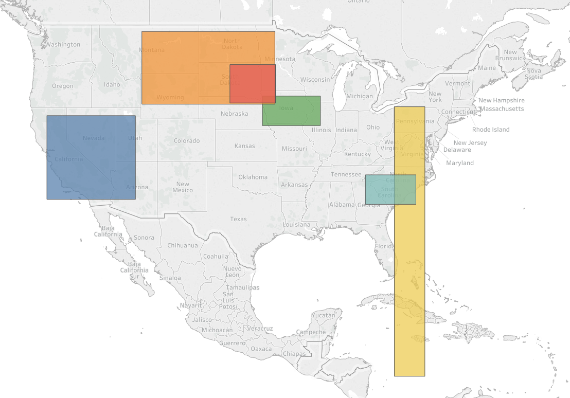 我为一组位置创建了一个最小和最大lat/长坐标的表。我想使用这些绘制矩形包围框在地图上,并包括其他属性作为工具提示,不知道从哪里开始。下面是一些示例组。