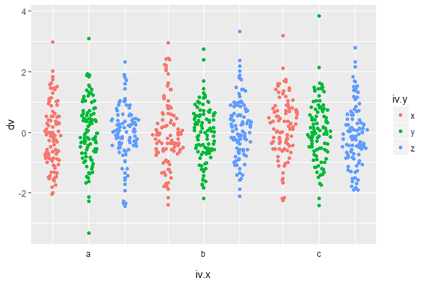 ggplot(DF, aes(iv.x, dv, colour=iv.y)) + geom_sina(position = position_dodge(width = 0.5))
