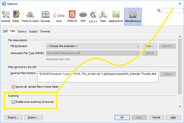 选中时,IDE将扫描项目的源代码,以检测任何外部修改的文件。当焦点返回到IDE时会触发扫描,例如当用户从另一个应用程序返回到IDE时。 如果您的源代码仅从IDE中修改,则可能会禁用自动扫描,而不会遇到问题。如果您正在处理大型项目,禁用自动扫描可能会提高IDE的性能。 默认情况下自动扫描是启用的。