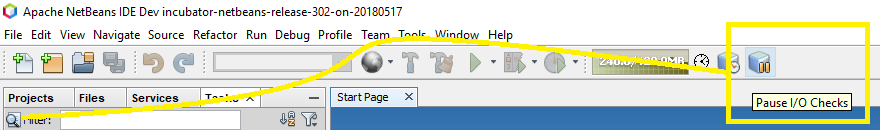 单击按钮将挂起/继续扫描。该功能已经内置到NetBeans 8.2的夜间构建和Apache NetBeans 9.0 RC.1中。要显示该按钮,请确保选中视图>工具栏>性能: