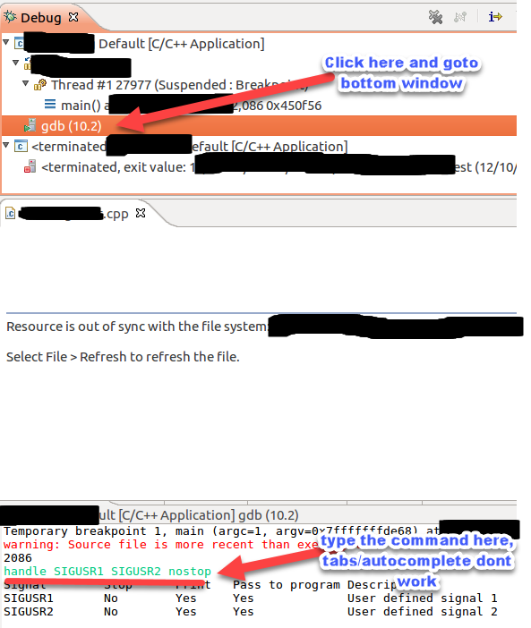 我正在eclipse/gdb/ubuntu下调试一个c++应用程序。应用程序周期性地引发信号SIGUSR1。(这里安装了一个观赏者)。