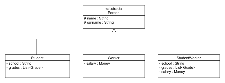 下图显示了StudentWorker如何从Worker和Student继承,尽管这在每种编程语言中都是不可能的,可能还会导致钻石问题。