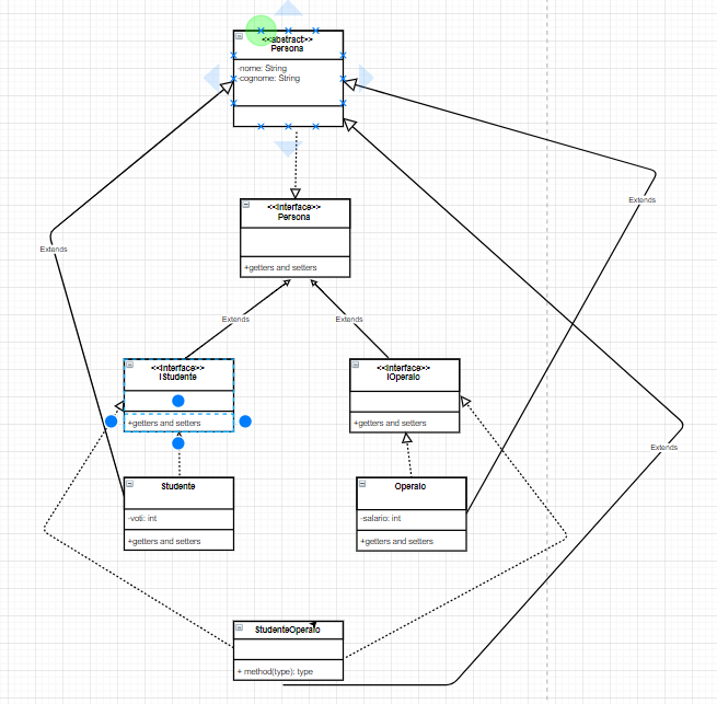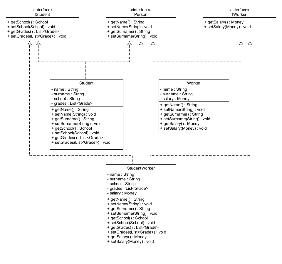 请注意,您仍然需要3类。Student和Worker分别实现两个接口,StudentWorker实现所有三个接口。这使得所有三个类都是Person,Student是IStudent,Worker是IWorker,StudentWorker是IStudent和IWorker。我希望这有助于或给您一个关于如何创建您的个人解决方案的想法。