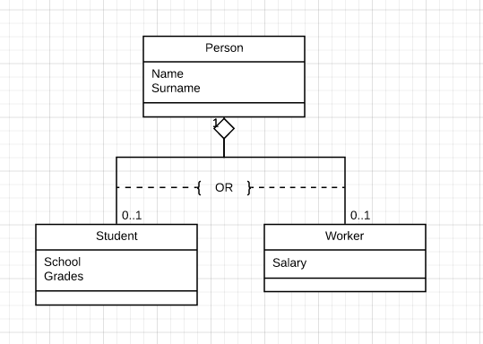 这也意味着,通过要求人是抽象的,一个人必须是一个学生,一个工人,或者两者兼而有之。这可以由两个类之间的or约束指定。