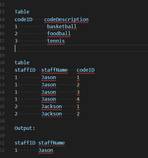 在本例中,Jason拥有代码表中的所有代码,而Jackson只有一个代码短缺(codeID 3),因此只有Jason返回。