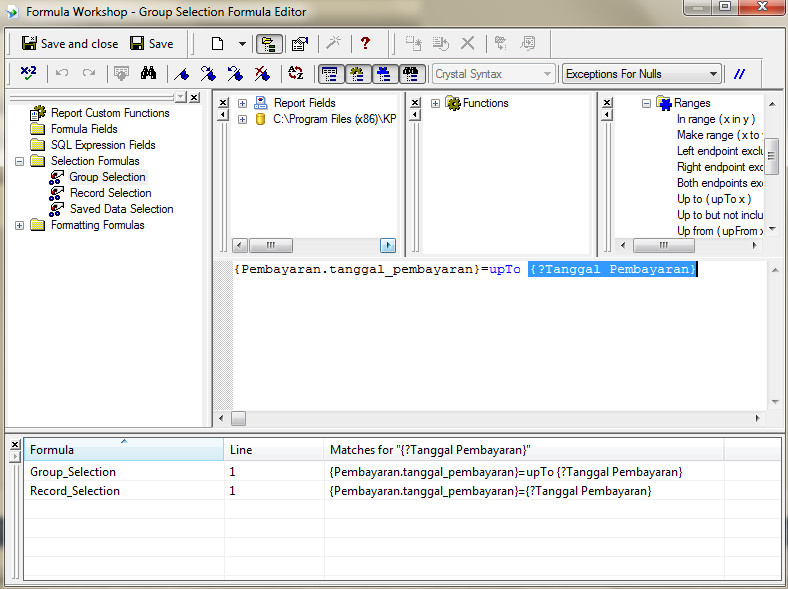我想用字段tanggal_pembayaran作为参数对我的数据库进行排序,在水晶报告的选择公式中使用组选择,但是下面是公式的样子: