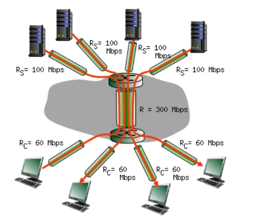 这四对共享一个具有R = 300 Mbps传输容量的公共中间跳。从服务器到共享链路的四个链路具有RS = 100 Mbps的传输容量。从共享中间链路到客户端的四个链路中的每一个都具有RC = 60 Mbps per second的传输容量。在回答以下问题之前,您可能需要查看文本中的图1.20:
