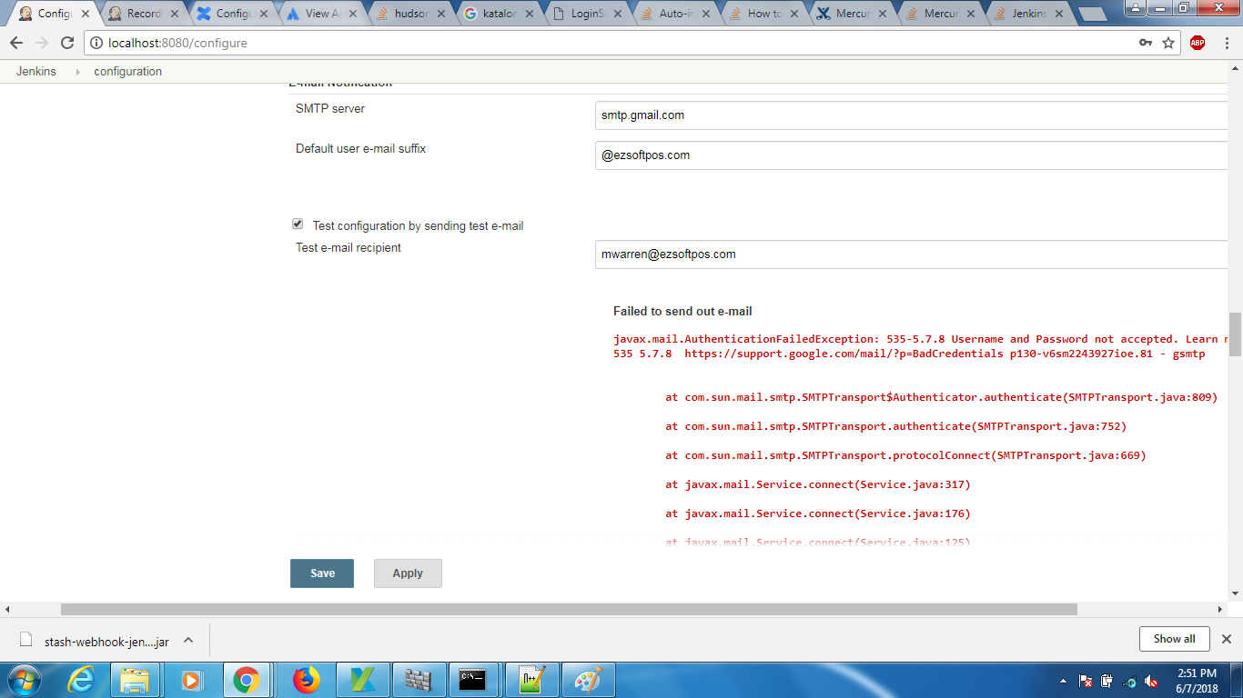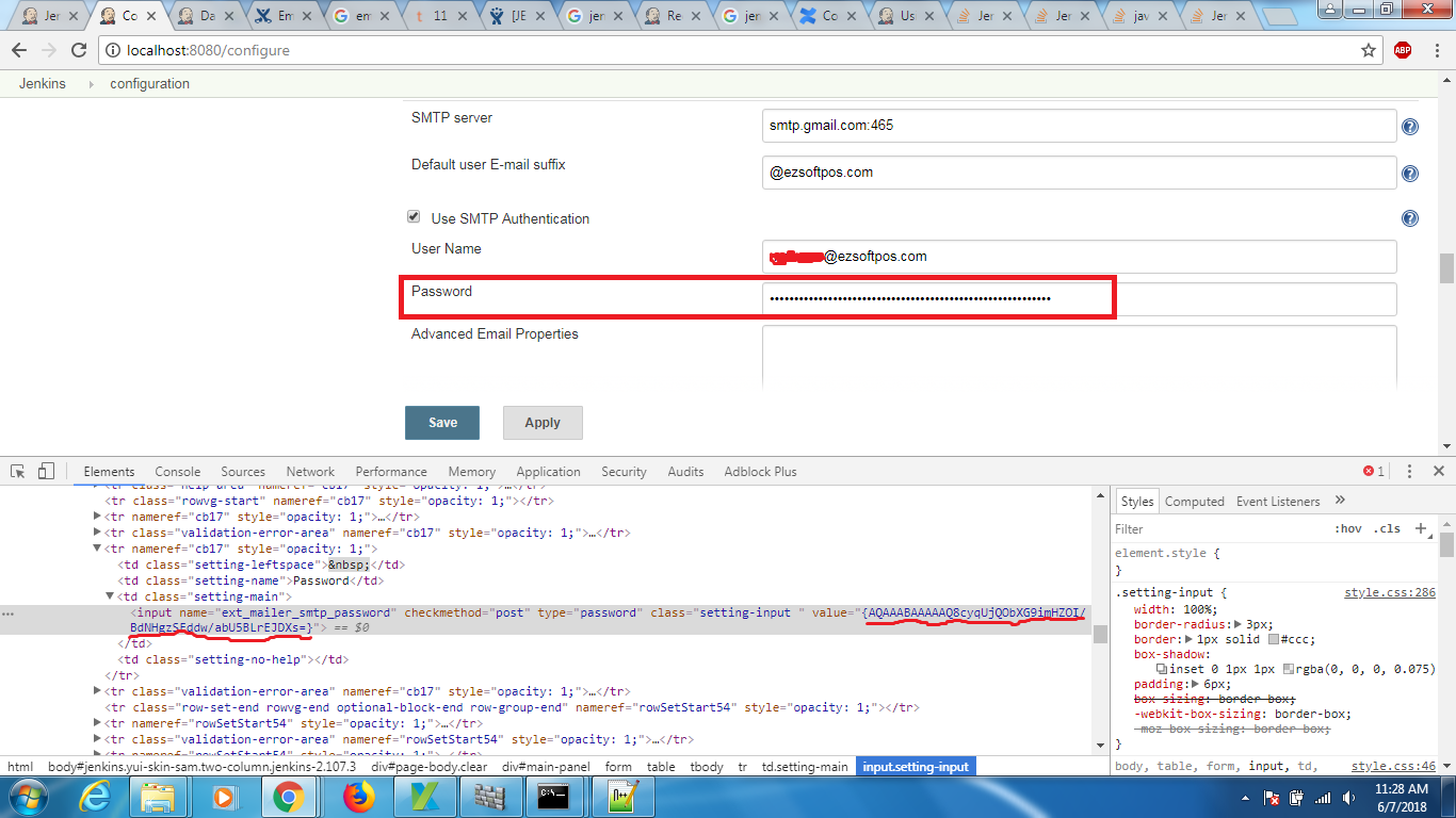 我正在尝试测试和使用给Jenkins的电子邮件-ext插件,并根据文档设置它,包括将SMTP服务器设置为smtp.gmail.com:465、输入默认电子邮件后缀、在SMTP身份验证字段中输入我的用户名、密码、单击“使用SSL",.我申请了修改后保存,然后回来,看到Jenkins在password字段中对我保存的密码进行了散列,因为我的8到16个字符密码不在那里。