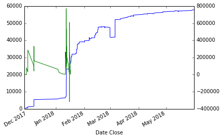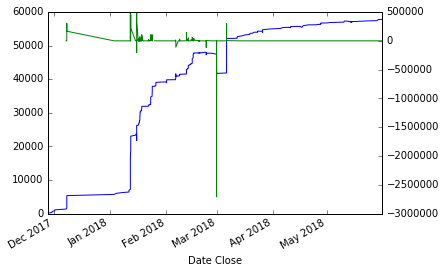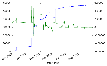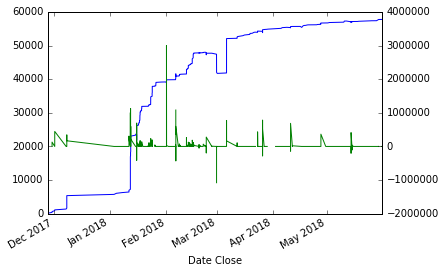 时间序列蓝色(左标度),导数绿色(右标度)