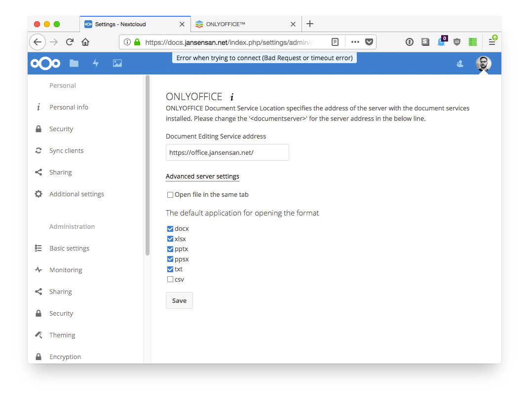 当试图将NextCloud连接到OnlyOffice的文档服务器时,会引发一个错误,但为了修复该问题,将不会提供太多其他错误。