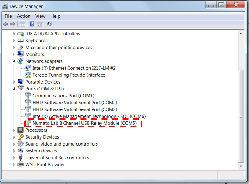 在COM9上调用该设备。但是,如果我在另一个计算机端口号上运行我的程序和串口设备,那么设备的名称在每台计算机上都是相同的。例如,在这张图片中,我想与"Numato Lab 8 Channel USB中继模块“通信,而不考虑COM端口号(名称总是与端口号相同)。