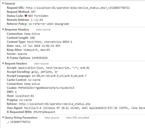 我很长一段时间都想不出这点了。ajax请求在远程设置的linux机器上工作得很好,但是当我在windows机器上尝试相同的请求时,会呈现一个403错误。