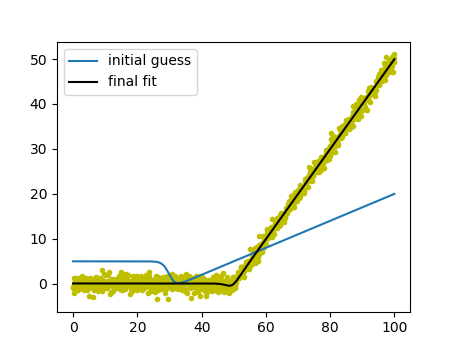 我给出了参数(x0, c, m, q)的合理的初步猜测,如图所示。拟合结果表明,除了第一个x0参数外,所有参数都得到了优化。