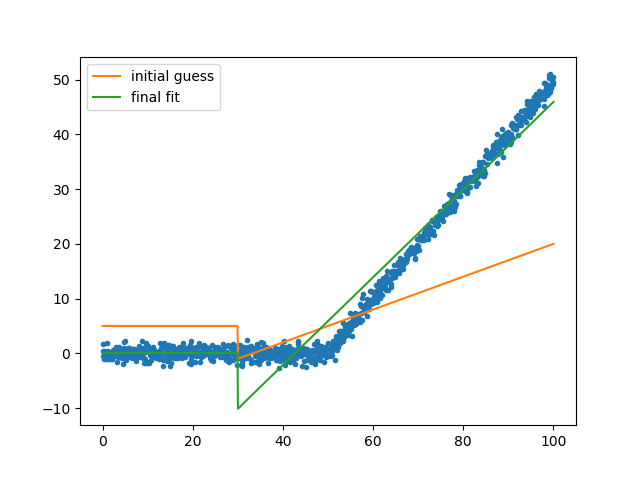 我需要与scipy.optimize.curve_fit配合一些数据,这些数据看起来像图中的点。我使用了一个函数y(x) (参见下面的def ),它为x<x0提供了一个常数y(x)=c,否则就是一个多项式(例如第二条倾斜线y1 = mx+q)。