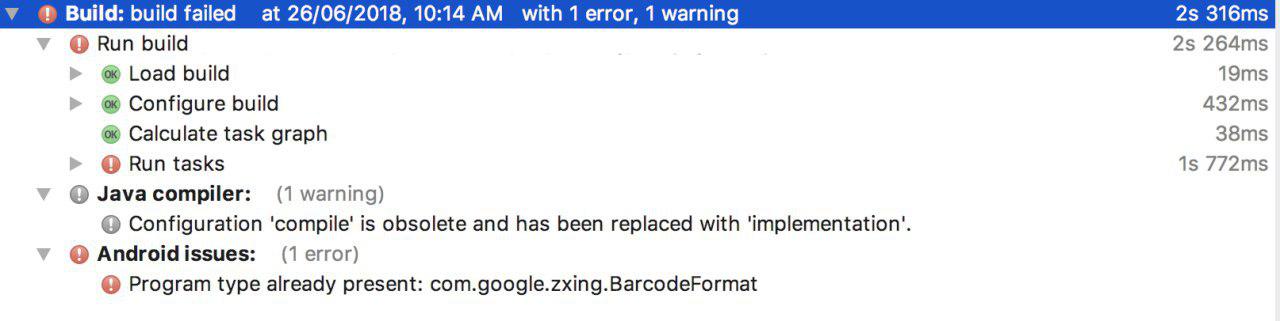 因为在新项目中您更改buildToolVersion的原因:它之所以发生是因为core.jar和zxing解决方案之间的冲突:只需更改buildToolVersion和构建,然后再还原旧的toolVersion并重新构建!