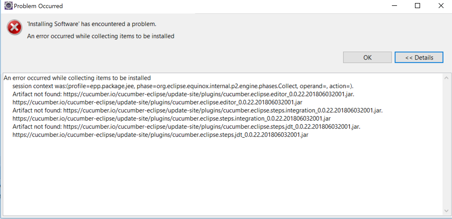 收集要安装的会话上下文的项时发生错误:( phase=org.eclipse.equinox.internal.p2.engine.phases.Collect,、profile=epp.package.jee、operand=、action=)。工件未找到:0.0.22.201806032001.jar。0.0.22.201806032001.jar神器未被发现:0.0.22.201806032001.jar。0.0.22.201806032001.jar神器未被发现:0.0.22.201806032001.jar。0.0.22.201806032001.jar