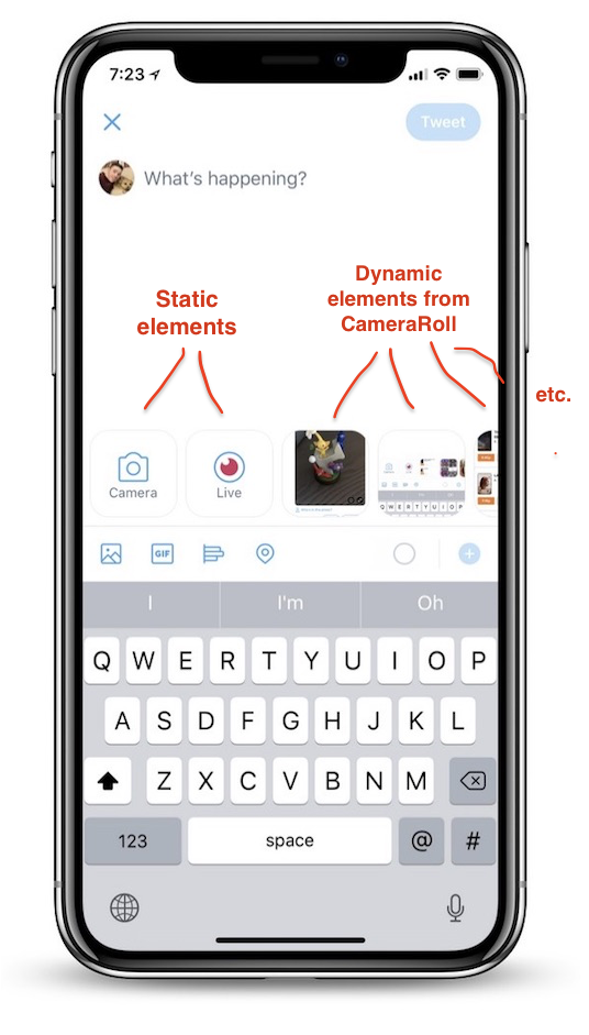我不知道如何将最初的2-3个元素作为静态元素,然后通过CameraRoll或其他方式添加动态元素。