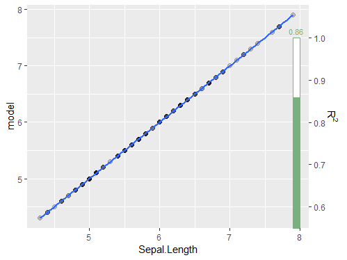 + annotate("text", x = 1, y = 1, label = paste0("R Squared = ", summary(modellm)$r.squared))