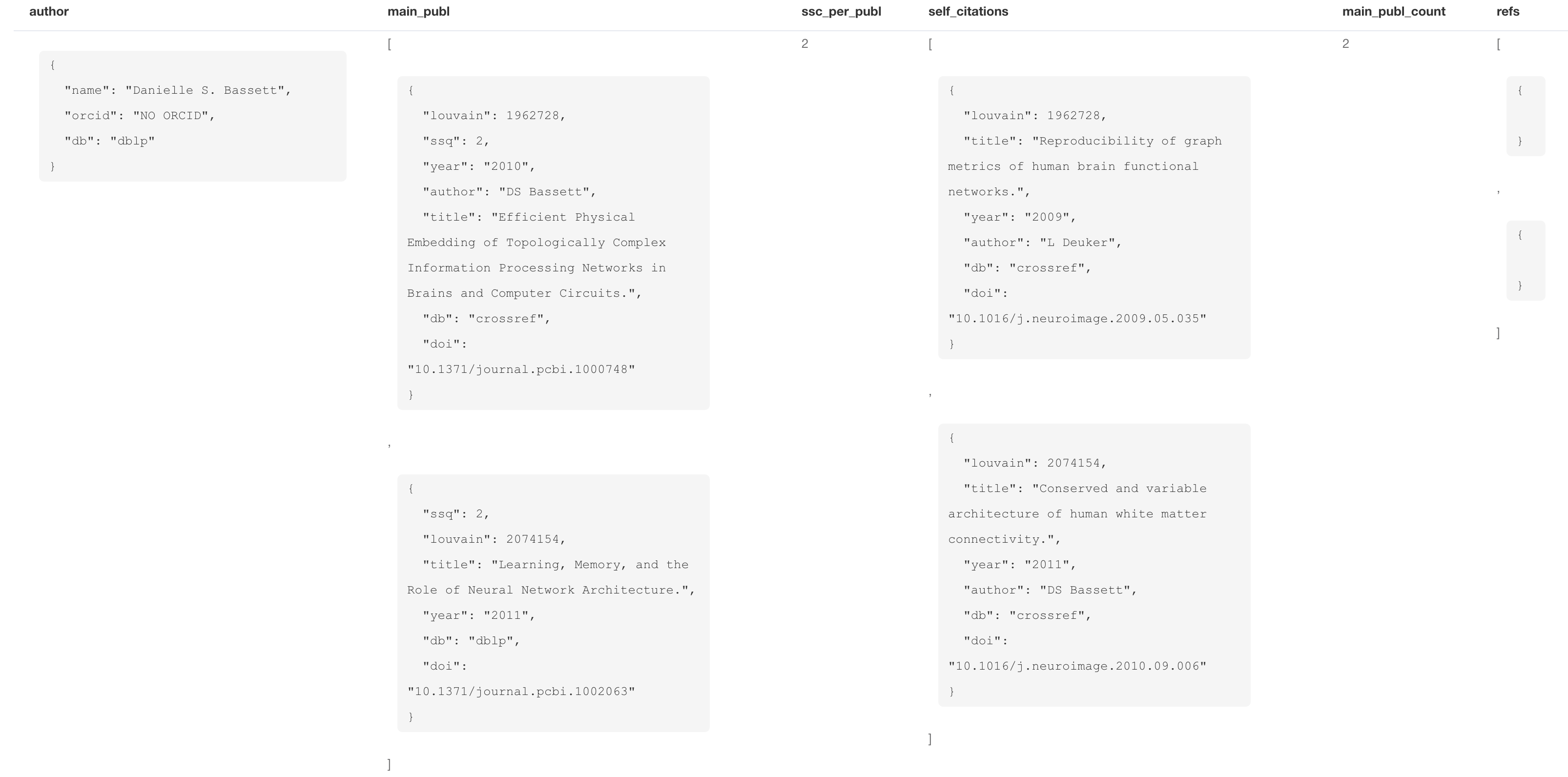 return author, main_publ, ssc_per_publ, self_citations, main_publ_count, refs此查询作为表的结果如下所示: