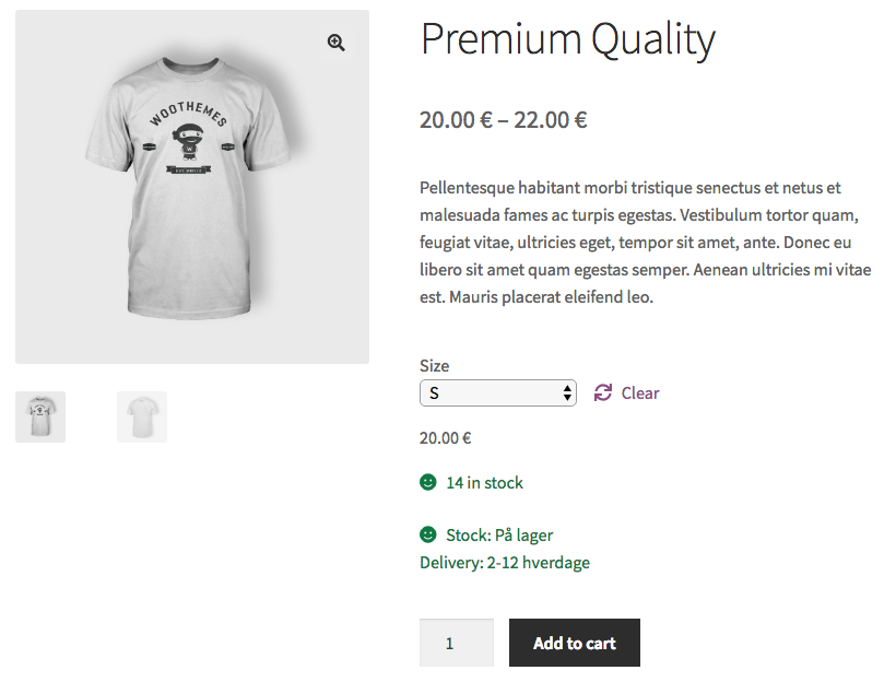 $variation_data['text_field'] = __('<p class="stock in-stock">Stock: <span>På lager</span><br>Delivery: <span>2-12 hverdage</span></p>');