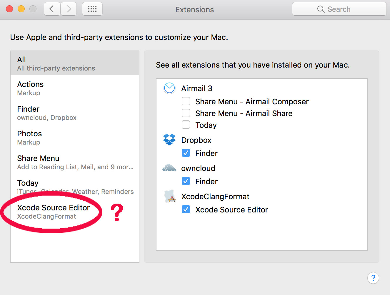 在系统首选项>扩展中有激活Xcode源代码编辑器选项的方法吗?出于某种原因,它没有显示在我的Mac (最后一个选项)。