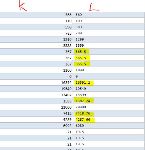 它正常工作,除非K列的价格是小数点的美分。我确实将小数的格式设置为0,但它不起作用。如果我点击某些价格,例如367,顶部的是376.5,而我的功能是365.5。