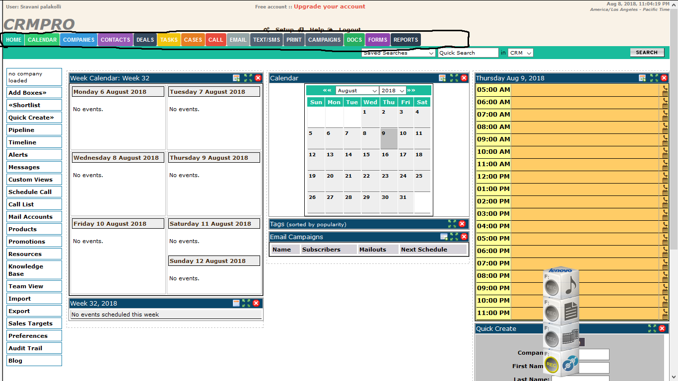 [HOME, CALENDAR, COMPANIES, CONTACTS, DEALS, TASKS, CASES, CALL, EMAIL, TEXT/SMS, PRINT, CAMPAIGNS, DOCS, FORMS, REPORTS]