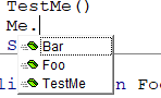 但是,如果在类中使用Me.,则可以使用Intellisense查看可用的子、函数和属性,这可能有点方便: