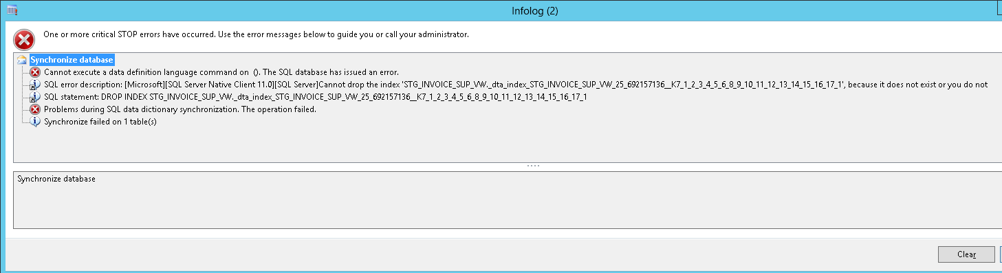 整个问题与从SQL side创建的附加索引有关。如果您从SQL侧在AX表上创建了一个索引,那么您将无法同步该表,或者您创建的索引将在同步时被删除(正如一些用户所建议的)。