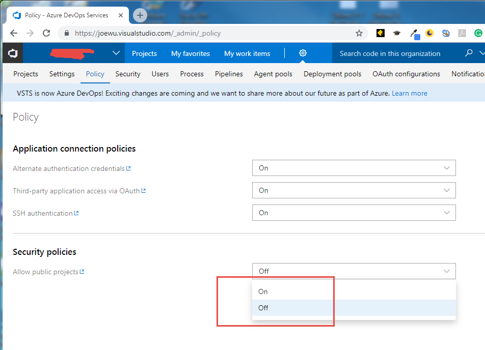 登录您的VSTS帐户,并在“设置”\策略下登录