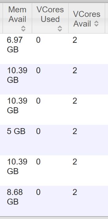 Node: http://mnode06.cluster.local:8044 Rack: /default-rack, RUNNING, 0 containers used, 0.0 / 10.4 GB used, 0 / 2 vcores used