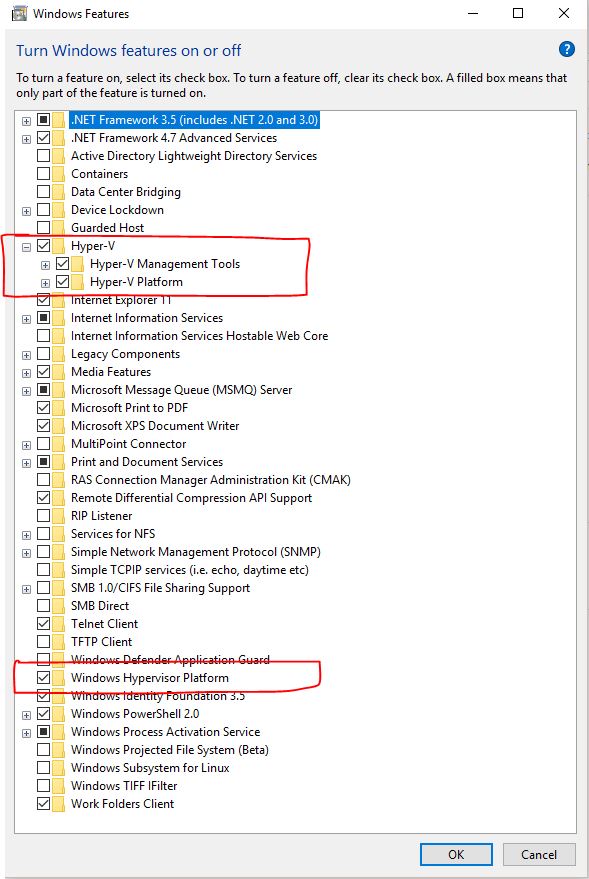 我已经启用了两个Hyper-V选项,但没有平台。我想不需要一个码头集装箱。