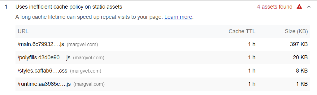 报告中显示的文件是main.js、polyfills.js、runtime.js和styles.css。据我所知,这些是我网页的主要部分。我在考虑使用角度服务工作者来增加缓存。但我没办法这么做。