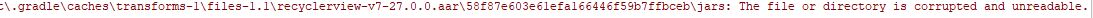 今天,当我打开我的android时,我发现了一件奇怪的事情:.gradle\caches\transforms-1\files-1.1\recyclerview-v7-27.0.0.aar\58f87e603e61efa166446f59b7ffbceb\jars:文件或目录已经损坏,无法读取。。我尝试过使缓存失效并重新启动、清理和重建项目。什么都没起作用。