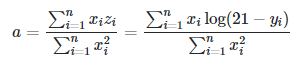 其中我的E2:E22只是你的x,而我的F2:F22是ln(21-y)。它给出了同样的答案,0.147233112,做指数拟合,并强迫截距为零(对应于将b=1设置为