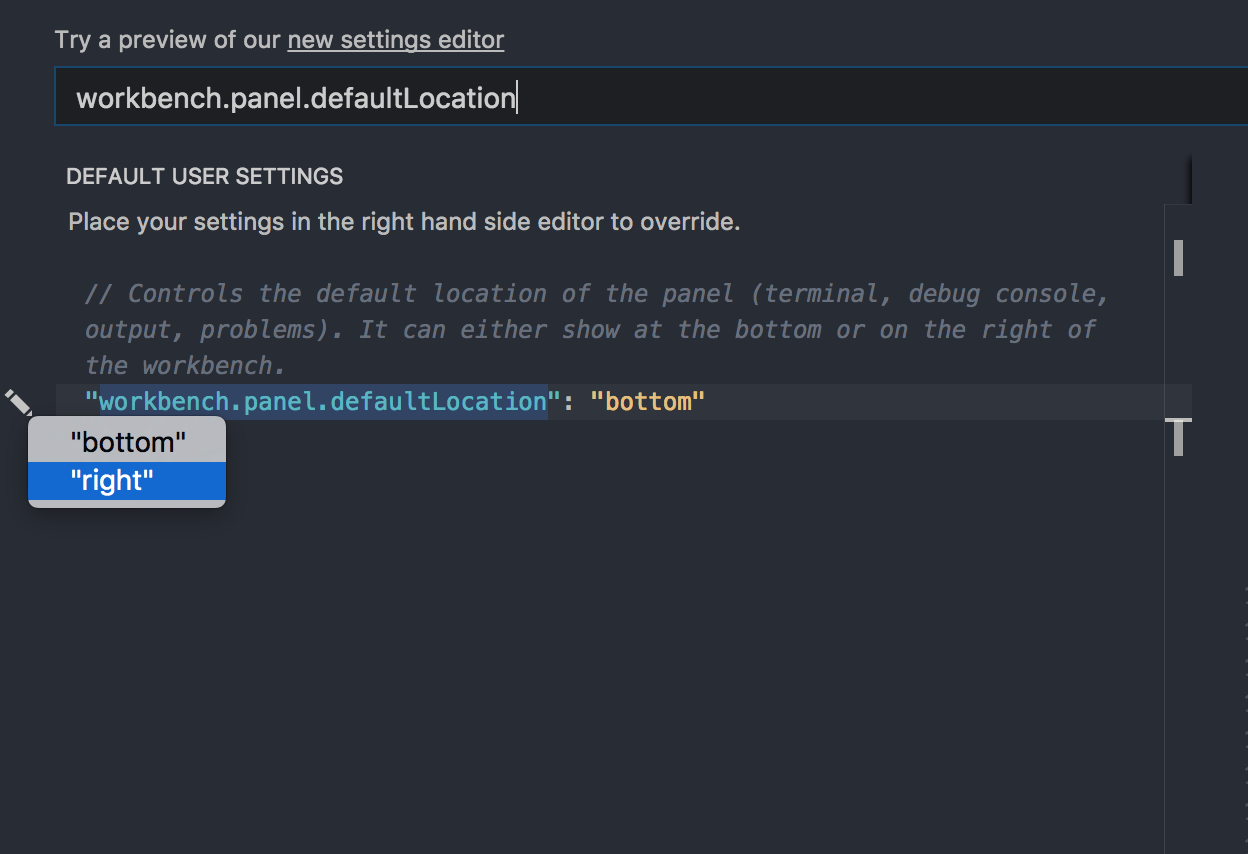 尝试将"workbench.panel.defaultLocation": "right"添加到用户/工作区设置中