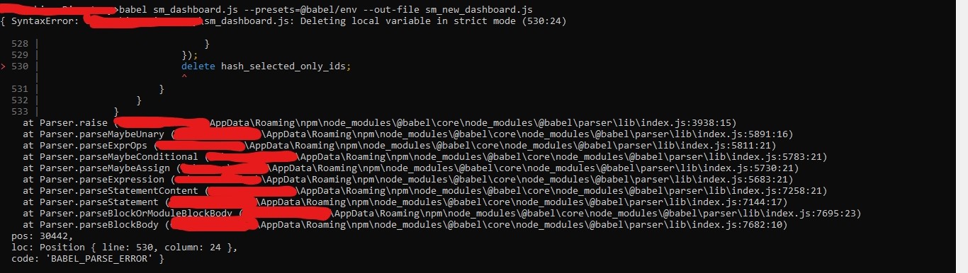 在默认情况下,我试图在严格模式下传输一组js files.As babel,当发生冲突时它会输出语法错误--例如,我正在寻找的删除keyword.The解决方案的使用是以某种方式忽略这个严格模式。请注意,我正在做以上操作使用babel,并没有项目设置。
