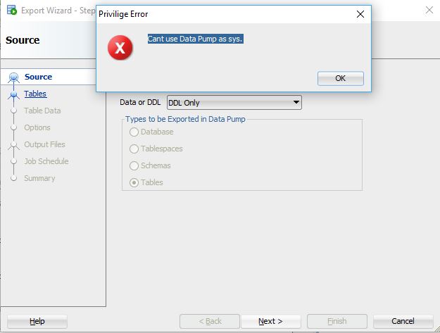 我想导出转储文件DDL我的数据库(Oralce数据库版本11.2.0.4)。我创建了用户并授予了权限(sysdba)。我使用上面的用户连接到数据库,我选择View -> DBA -->数据泵-->数据泵导出向导-->选择上述->连接->并警告错误"Cant use Data Pump as sys“。