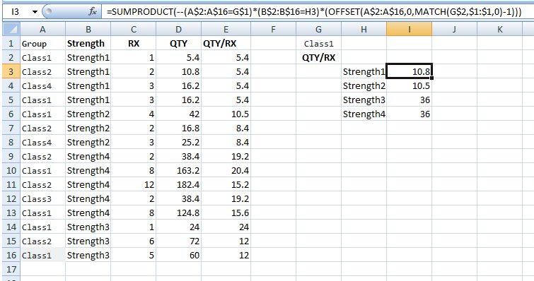 =SUMPRODUCT(--(A$2:A$16=G$1)*(B$2:B$16=H3)*(OFFSET(A$2:A$16,0,MATCH(G$2,$1:$1,0)-1)))