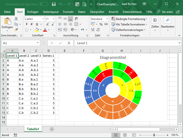我有一个要求,不同的数据点的颜色,在一个Excel太阳暴晒图编程。默认情况下,Excel创建的图表如下所示。