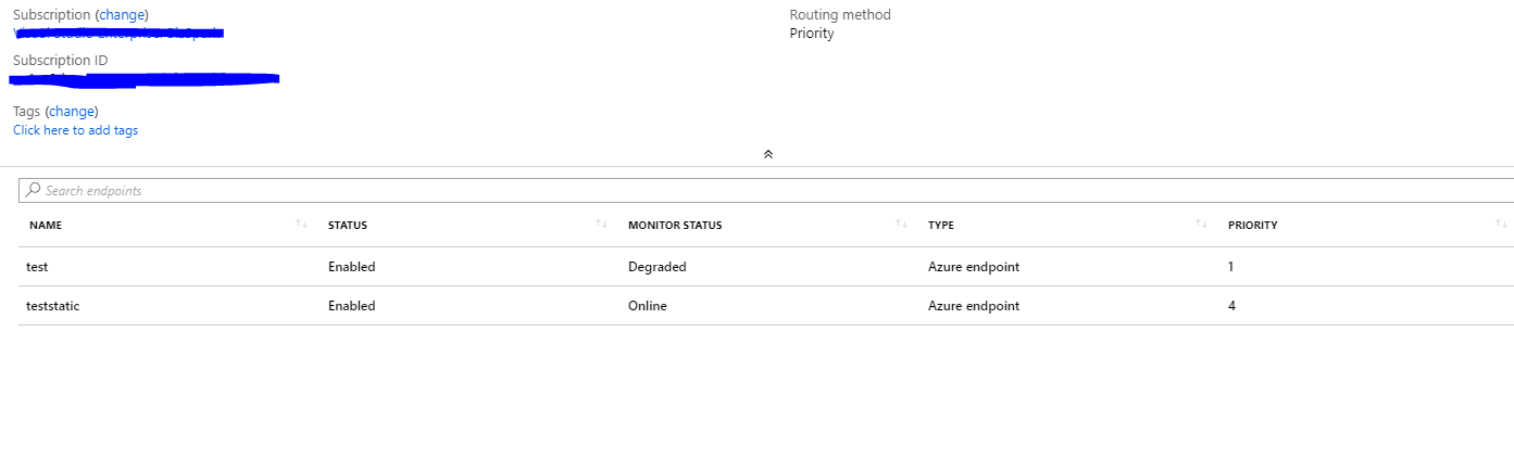 在屏幕截图中,测试端点监视器状态始终是降级的状态。这表明端点不包括在DNS响应中,并且不接收通信量。因此,流量管理器仍然指向测试静态站点。只有当探测接收到来自探测路径的HTTP 200响应时(如果监视协议是HTTP或HTTPS ),流量管理器才会认为端点是ONLINE。任何其他非200的反应都是失败的.