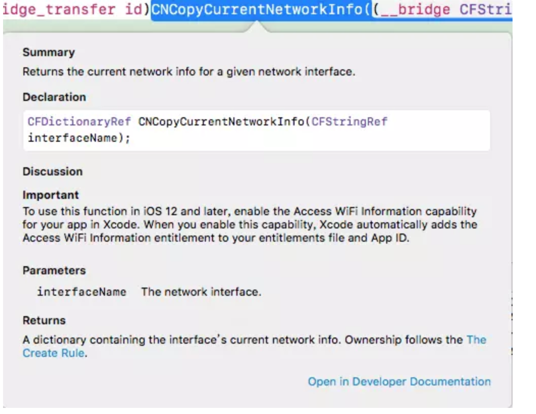 若要在iOS 12及更高版本中使用此函数,请为应用程序启用Access WiFi Information功能。