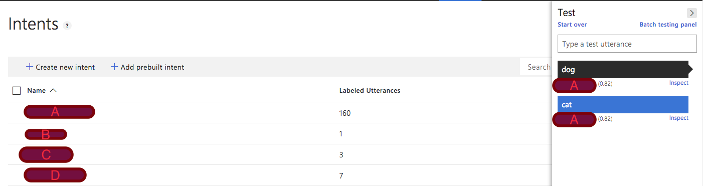 实际:当用户键入随机词时,它与luis匹配,标记的语句数量最多。如果输入了诸如“情感”这样的词,它将与"A“意图相匹配,因为意图A包含了数量最多的标记话语。
