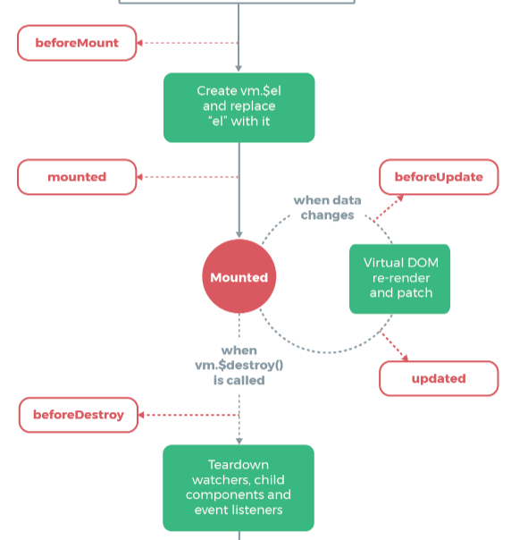 在Vue实例生命周期中,一旦DOM更改,钩子beforeDestroy就会被调用。