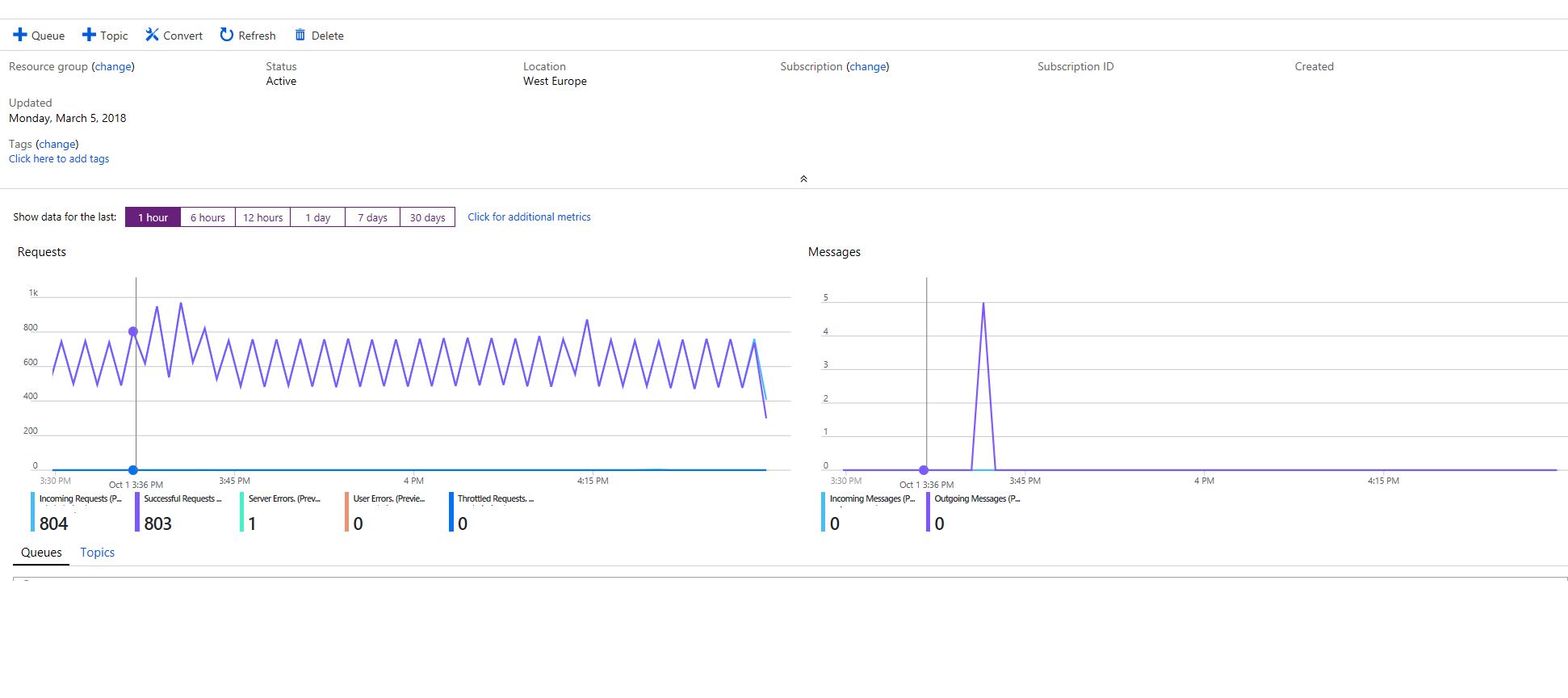 请参阅下面Azure服务总线中的指标。当流量较低时,想要在请求/响应的数量中识别背景噪声。假设振荡的请求\x响应潜伏在会话上的amqp握手。只是不明白这是什么类型的握手?从总线接收的客户端应该已经向总线(作为发件人)发出了信用。所以不应该需要投票。还是真的有?这里还有另一个背景流吗?