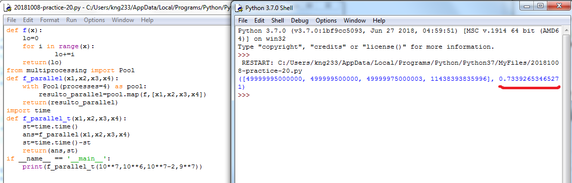 现在让我们检查一下。对于x=10**7,9**7,10**7-2,10**6正常f= 0.53,0.24,0.53,0.04秒。其中四个f_parallel需要1.39秒!我希望看到0.53秒,因为我使用的计算机有4个cpus,我在池中选择了4个cpus。但为什么会这样?