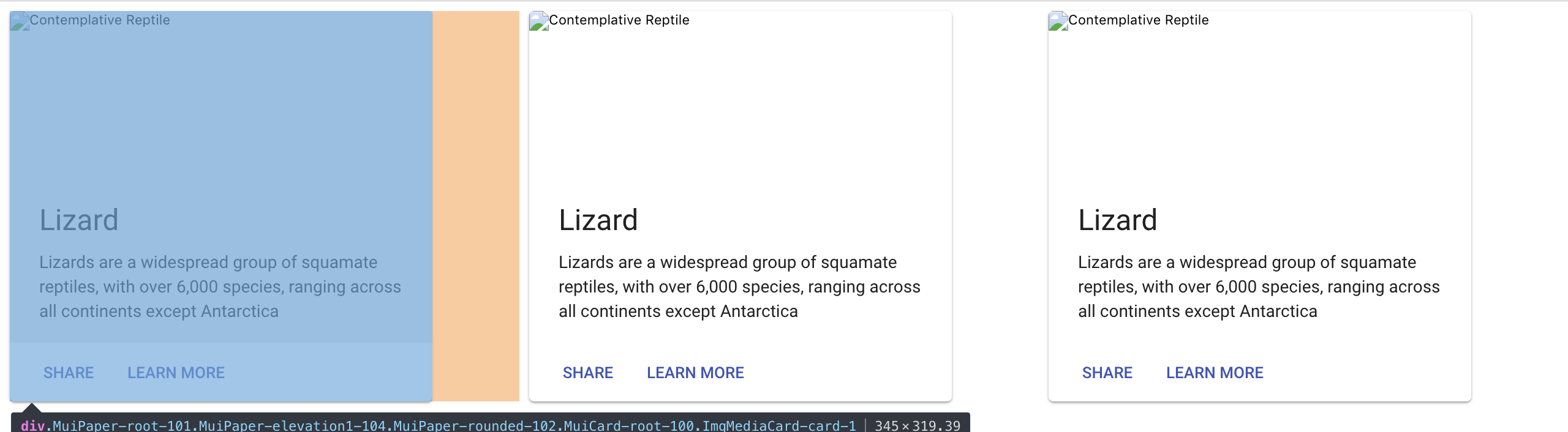 我试着在一个格子里显示三张卡片。卡的媒体最大宽度为345 of,但由于这个原因,卡片获得了很大的空白。在网格中造型看起来不太好。有谁知道我怎么才能摆脱保证金吗?