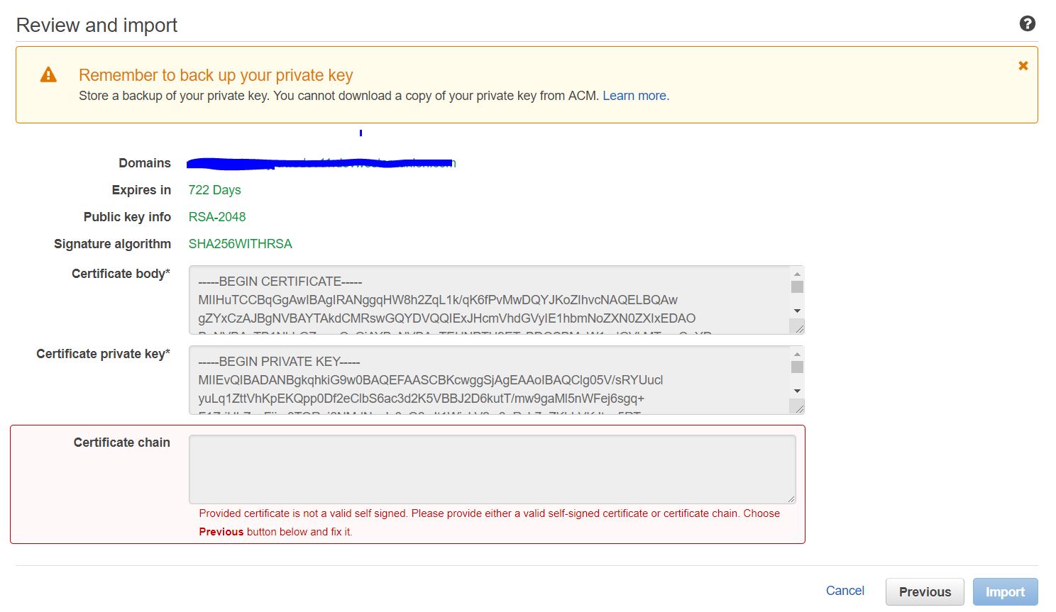 当我试图在AWS ACM上导入证书时,我会收到此错误。